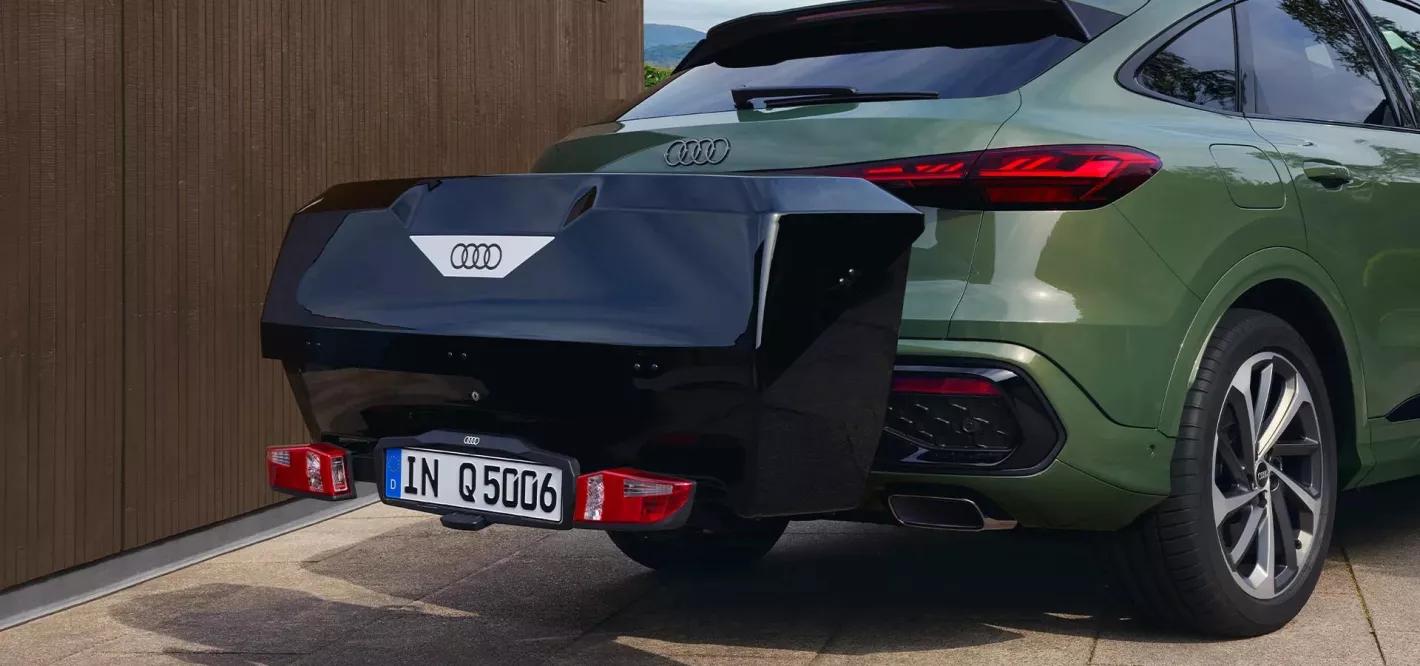 Maak je Audi Q5 Sportback nog praktischer met Originele Audi Accessoires, zoals een flexibele zwenkbare trekhaak of de veelzijdige trekhaakkoffer. Deze afsluitbare koffer biedt 300 liter extra ruimte, is uitgerust met wielen voor eenvoudig transport en past perfect bij het iconische Audi-design. Ideaal voor reizen en avonturen zonder in te leveren op stijl.