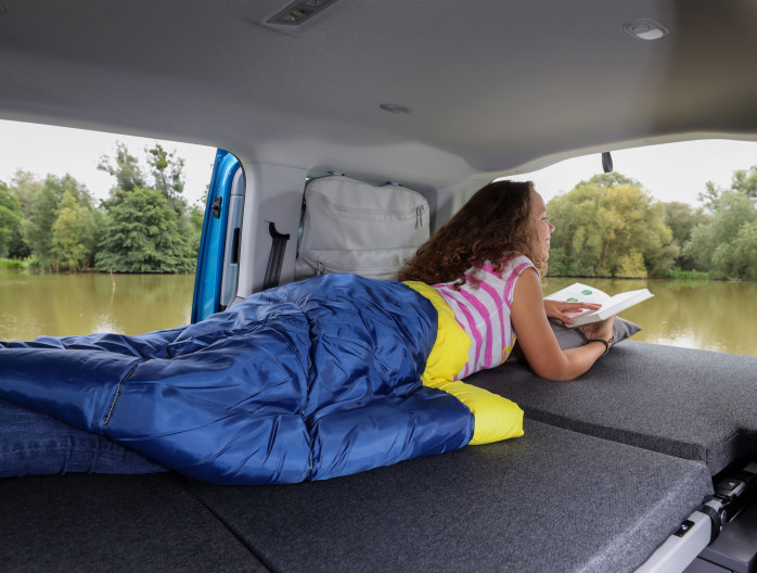 Het uitklapbaar bed is met 198 x 107 cm zeer ruim en zijn hoogwaardige matras biedt hetzelfde goede slaapcomfort als de bedden in de grote California's. Daarnaast vind je achteraan de Caddy een compact gasfornuis dat kan worden uitgeschoven op stahoogte.